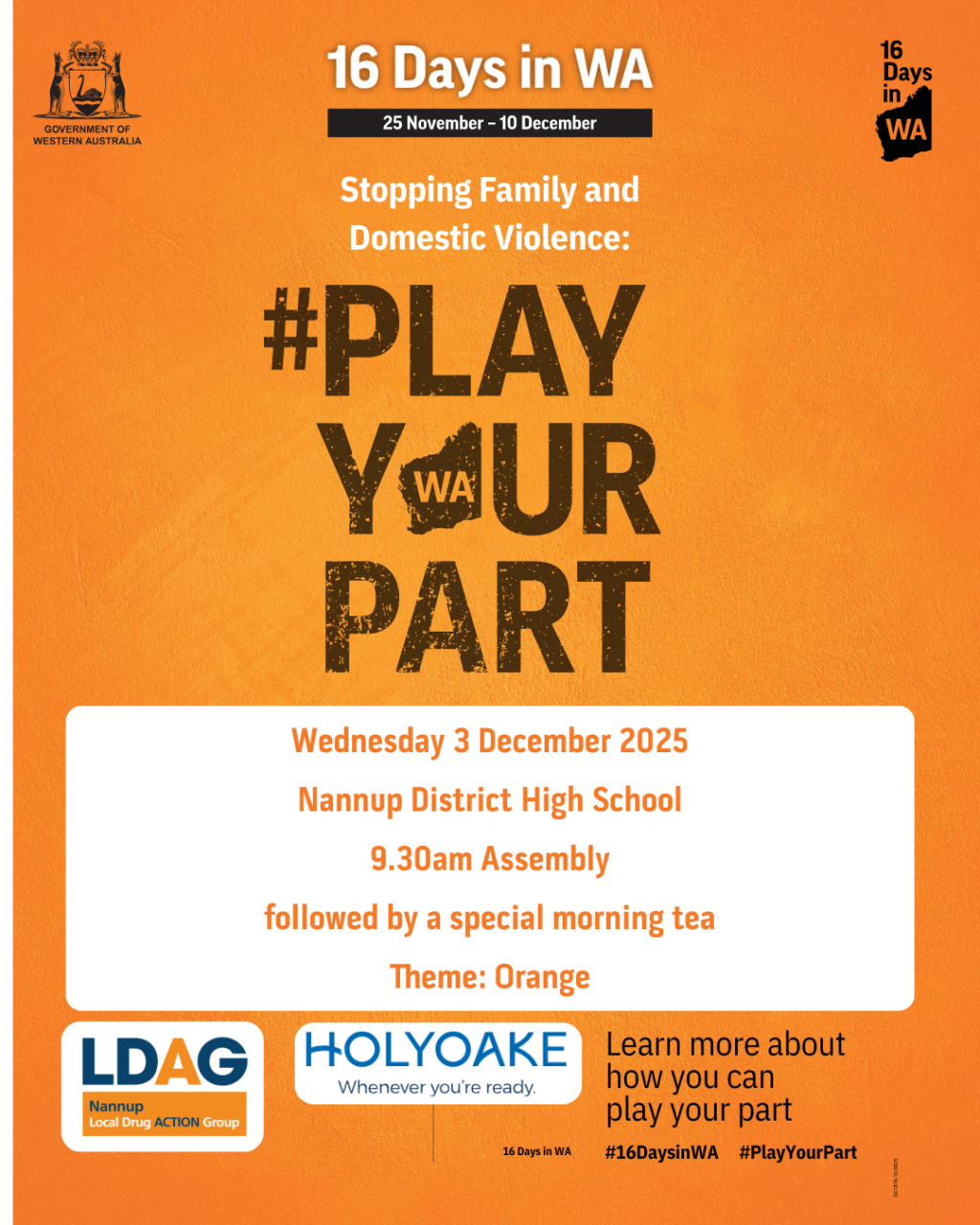 - A special 16 Days in WA school assembly at Nannup District High School to raise awareness about stopping Family and Domestic Violence.