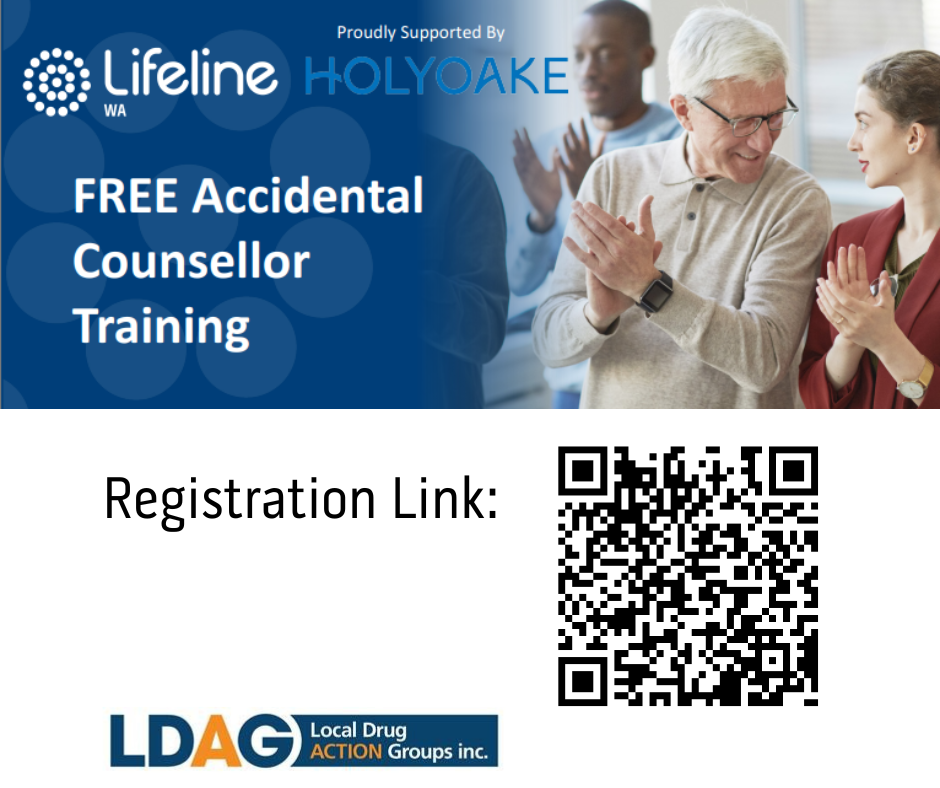 Accidental Counsellor is presented by Lifeline Funded by Holyoake and Supported by Nannup Local Drug Action Group (LDAG) and is aimed at those who would like to be able to safely and effectively support friends, family, colleagues, and peers who are in distress or experiencing a crisis.