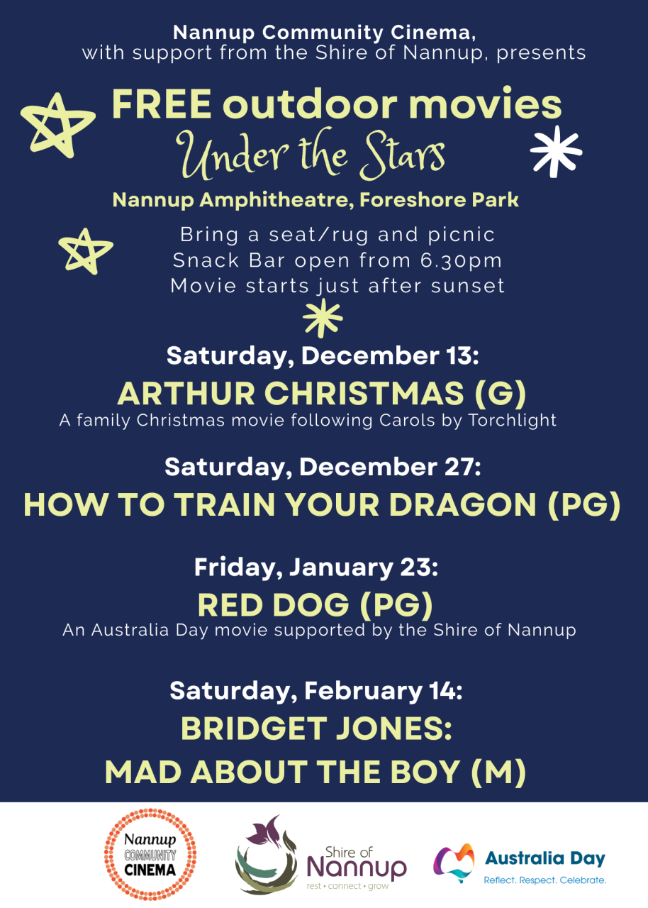 Enjoy warm summer evenings with a relaxed and inclusive series of free outdoor movie nights at Nannup Foreshore Park. Proudly presented by the Nannup Community Cinema and supported by the Shire of Nannup, these events are a great way to connect with the community under the stars.
