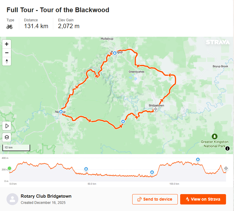 On Saturday 28 March 2026, between 8:30am and 1:00pm, cyclists participating in The Blackwood Tour will be travelling through sections of four Shires, including the Shire of Nannup.