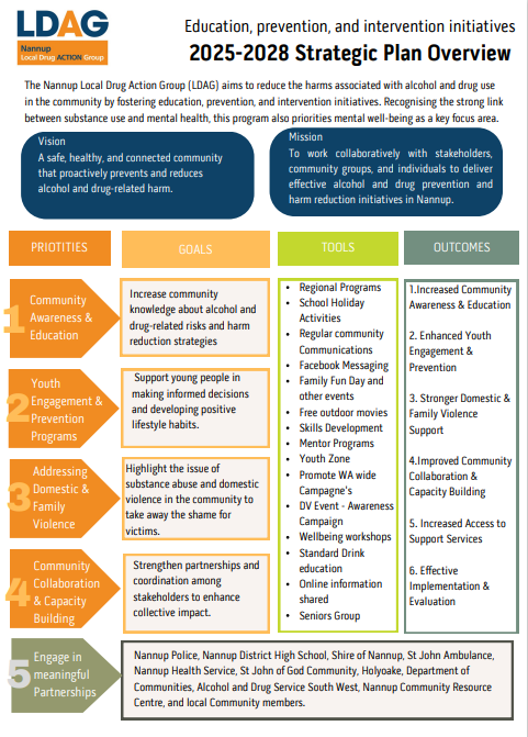 In 2025, the Nannup Local Drug Action Group (LDAG) updated its Terms of Reference to formalise its role as a working group of Council. The committee entered into a partnership with Holyoake to develop a Community Response Plan and continued its collaboration with the Alcohol and Drug Foundation. The LDAG remains a strong, community-based committee with key messaging focused on alcohol and other drugs, mental health and suicide prevention, and domestic and family violence.