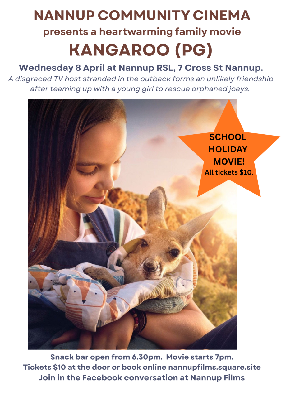 Kangaroo (PG) Poster $10.00 per ticket at the door or book online Home | Nannup Community Cinema Inc and follow on Facebook at Nannup Films.