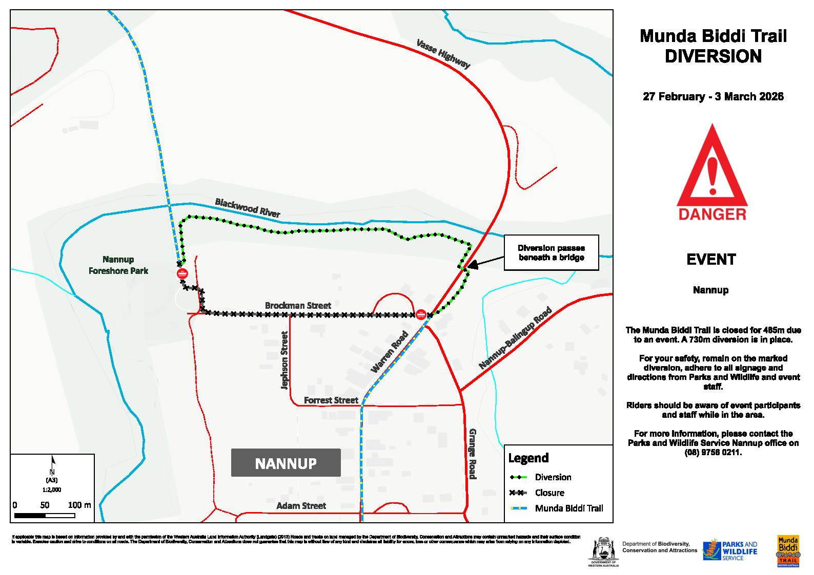 If you need further information, you can contact the Parks and Wildlife Service Nannup Office on (08) 9756 0211, or the Munda Biddi Trail – Jarrahwood office on (08) 9752 5555 or blackwood@dbca.wa.gov.au.