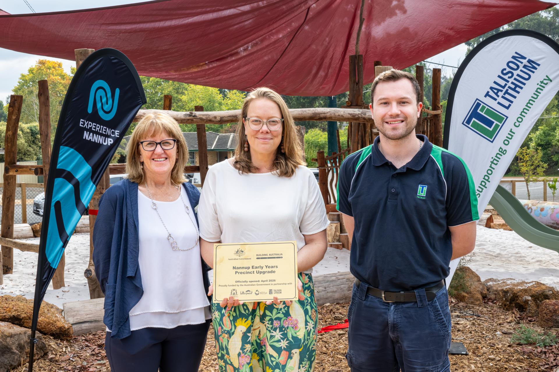 PHOTO CAPTIONS (Left to Right): Cr Cheryle Brown, Playgroup President Laura Francis-Kingshott and Talison Lithium Community Relations Officer Mitchell Wheatley with the Commemorative Plaque.